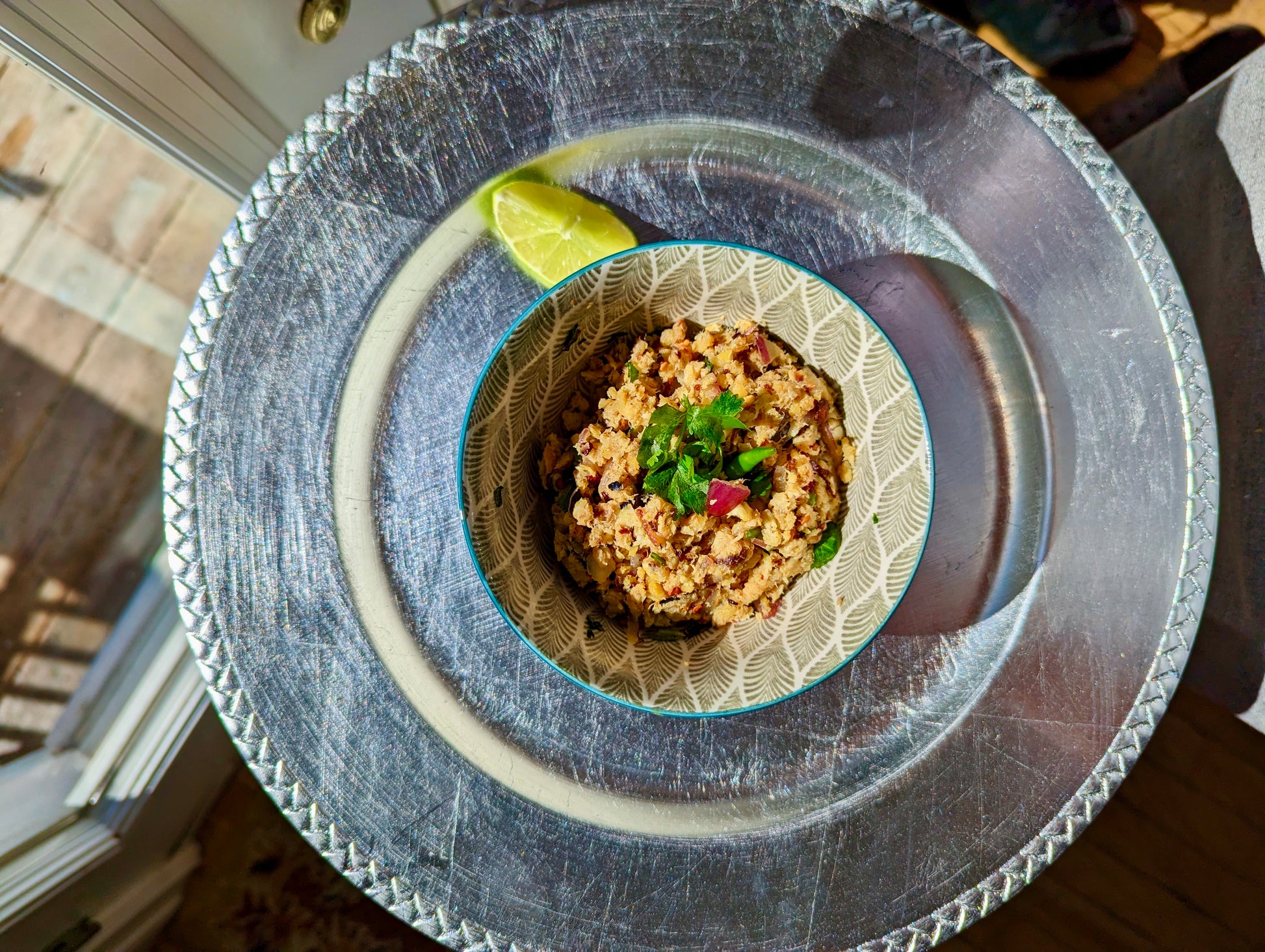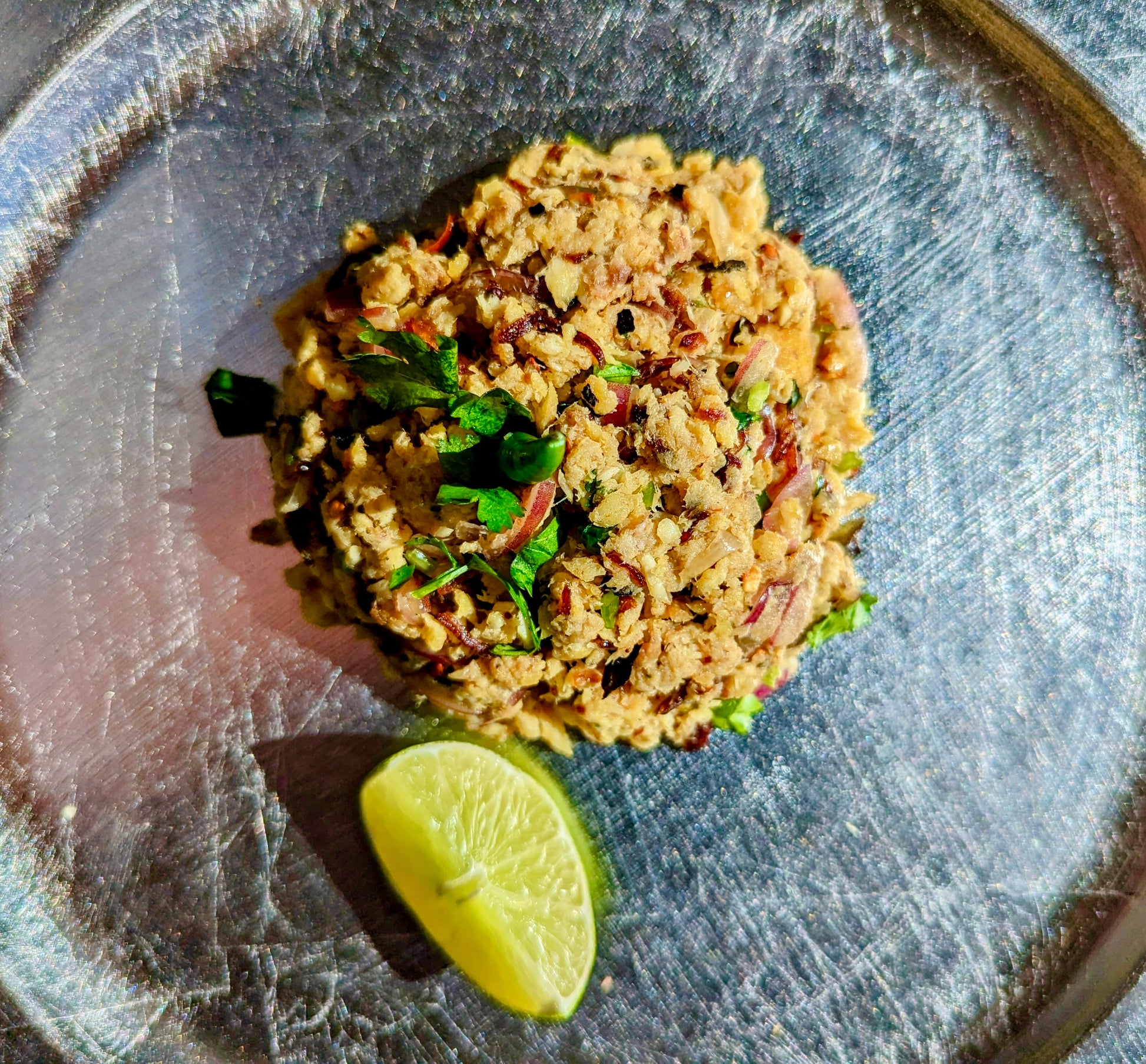 A combination of flaky boneless cooked "Tilapia" fish, fresh onions, fragrant herbs, and savory mustard oil creates a flavorful mash.