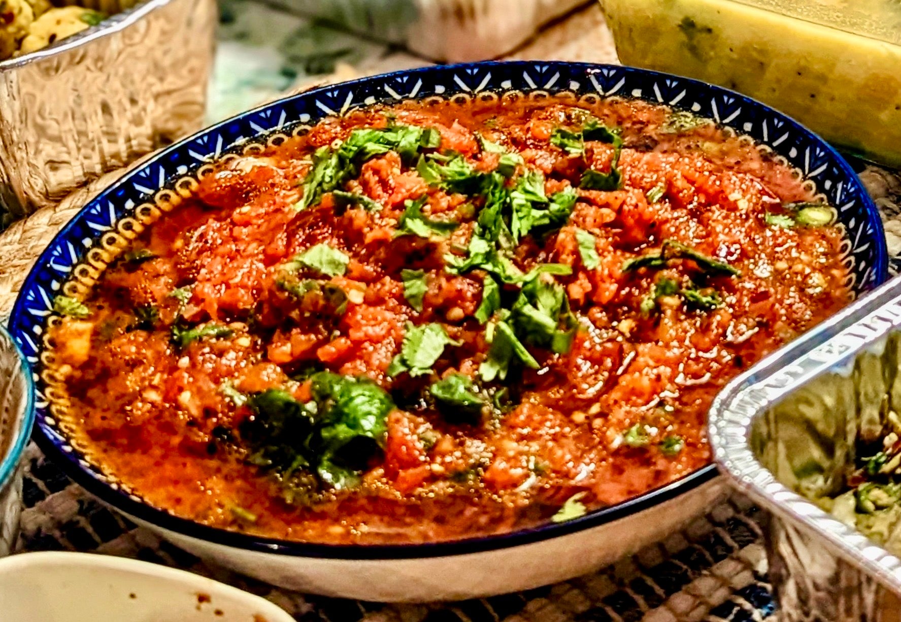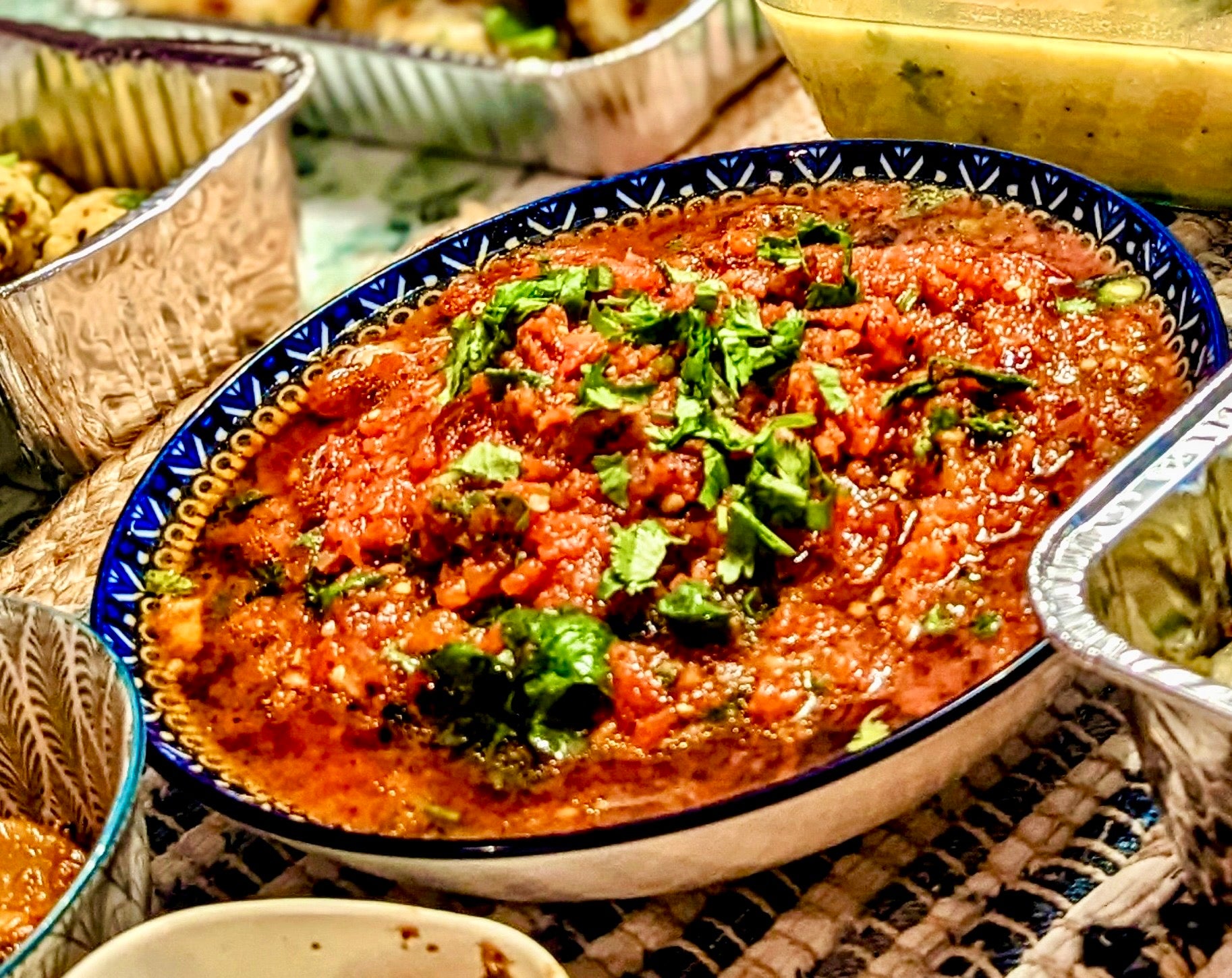 Tomatoes mashed with fresh onions, herbs, and mustard oil, a great way to tantalize the taste buds! The mustard oil brings an extra punch of flavor, while the herbs add an appetizing aroma, sure to please any palate!
